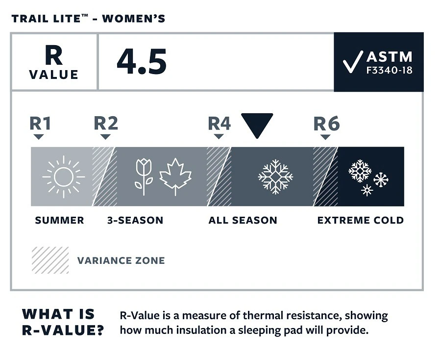 Le modèle femme (WR en 168 cm) est plus chaud, ce qui conviendra aux personnes les plus frileuses, le R-Value est de 4.5. La coupe du Trail Lite semi-rectangulaire augmente la surface de sommeil au niveau du torse et de la tête et favorise le rapprochement de deux matelas.